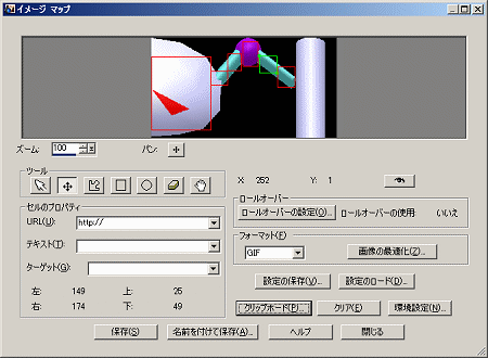 複数の領域座標を簡単に取得したいのであれば、グラフィックソフトのイメージマップ作成機能を利用するとよいでしょう。これはもともと、HTMLで表示するイメージ内でクリックできる領域を指定するためのタグを自動作成するためのものですが、これで生成された数値は、当たり判定領域としてすぐに転用することができます。