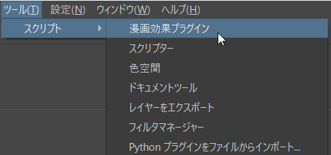 Kritaを再起動し、メニューに「ツール→スクリプト→漫画効果プラグイン」が表示されていればインストールは完了です。このメニューアイテムをクリックすると、設定ウィンドウが表示されます。