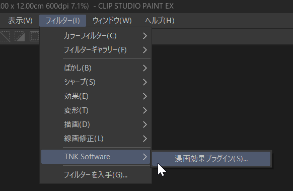 プログラムファイルが正常に認識されると、メニューの「フィルター」に「TNK Software > 漫画効果プラグイン」が追加されます。
