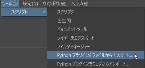 Krita向けプラグインをインストールするには、Kritaのメインウィンドウから「ツール→スクリプト→Pythonプラグインをファイルからインポート」を選択し、ダウンロードしたzipアーカイブ(cmplugin_krita.zip)を選択してください。