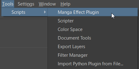 Restart Krita. If "Tools -> Scripts -> Manga Effect Plugin" appears in the menu, installation is complete. Clicking this menu item will open the settings window.