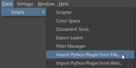 To install the plugin for Krita, select "Tools -> Scripts -> Import Python Plugin from File" from the Krita main window, then choose the downloaded zip archive (cmplugin_krita.zip).